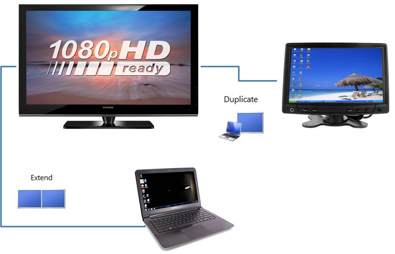 ผมต้องการต้องพ่วงอุปกรณ์ดังรูปอ่ะครับ พ่วงโน๊ตบุ๊คกับทีวี(หรือจอภาพก็ได้) แบบ EXTEND แลัวจะทำให้ ทีวีกับจอภาพ มัน Duplicate กันครับ ต้องต่อยังไงครับ