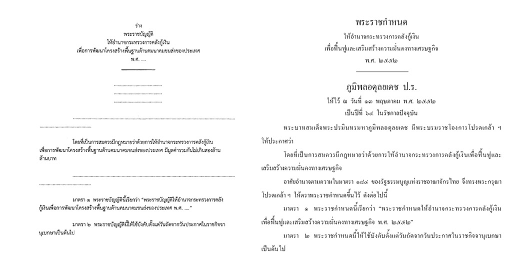 ทางซ้าย คือ ร่าง พรบ.ให้อำนาจกู้เงินพัฒนาโครงสร้างพื้นฐานคมนาคมขนส่งของประเทศ ส่วนทางขวา คือ พรก.ให้อำนาจกระทรวงการคลังกู้เงินเพื่อฟื้นฟูและเสริมสร้างความมั่นคงทางเศรษฐกิจ พ.ศ. 2552