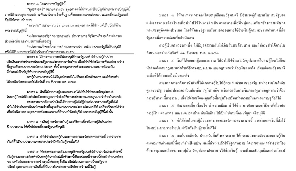 เปรียบเทียบกันให้เห็น มาตรา ต่อ มาตรา ว่ากฏหมาย พรบ.กู้เงิน 2 ล้านล้าน เป็นกฏหมายที่ถอดแบบ มาจาก กฏหมาย 4 แสนแล้าน สมัยประชาธิปัตย์ สิ่งที่แตกต่างคือ มีการระบุโครงการที่จะนำไปใช้และมีกระบวนการคัดกรองโครงการ ก่อนนำเสนอ ครม อนุมัติดำเนินการ แต่ ส่วน กฏหมาย 4 แสนล้าน เป็นเพียงกฏหมายลอยๆ ที่เขียนวัตถุประสงค์การใช้แบบกว้างๆ จนเอาไปใช้ทำอะไรก็ได้ที่ ครม.เห็นควร