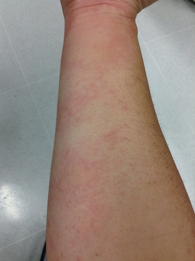 เป็นผื่นแบบนี้ขึ้นที่ลำตัวและบริเวรข้อพับแขนทั้ง2ข้าง วันแรกที่เป็นแค่แดงๆเเละคันพอ3-4วันลามและเป็นอย่างในรูปครับ