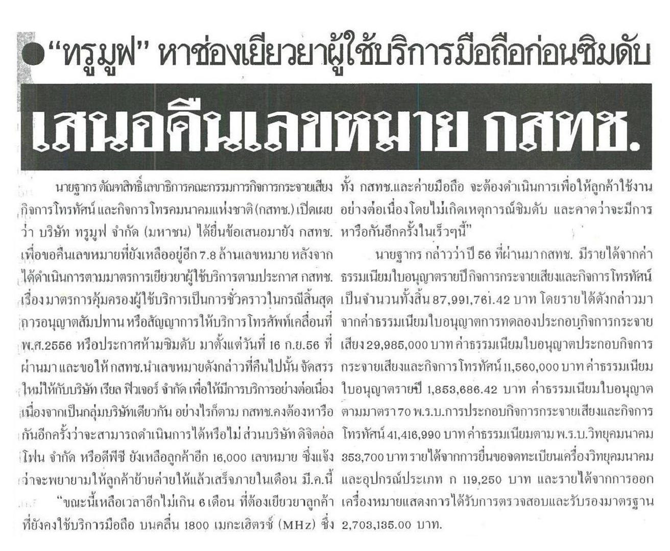 "ทรูมูฟ" หาช่องเยียวยาผู้ใช้บริการมือถือก่อนซิมดับ เสนอคืนเลขหมาย กสทช. (ไทยรัฐ 14 มีนาคม 2557)