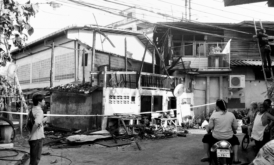 ไม่นึกว่า อะไรก็แปรเปลี่ยนไปโดยไม่ทันคิด ตอนเกิดเหตุไฟไหม้ ไฟลุกโหมเสาไม้จนเห็นเป็นตะโก ในใจก็แว่บนึกว่าจะเอากล้องมาถ่ายรูปดีไหม แต่อีกใจก็บอกอย่าเลย เคยเห็นคนที่บ้านโดนไฟไหม้แล้ว รู้ว่า ใจสลาย เพราะตอนเด็กๆ เคยเห็นบ้านเพื่อน อยู่ฝั่งตรงข้ามบ้านผม บ้านไฟไหม้ทั้งหลังไฟลุกโชน แล้วสะเทือนใจ