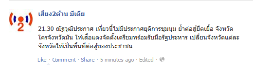 http://www.youtube.com/watch?v=jcNjtwwMs5M แกนนำ นปช. ประกาศยกระดับการต้านรัฐประหาร โดยย้ำว่าเป็นหน้าที่ของคนไทยทุกคน หลังจากที่ผู้บัญชาการทหารบก ให้สัมภาษณ์เกี่ยวกับการรัฐประหารว่าขึ้นอยู่กับสถานก