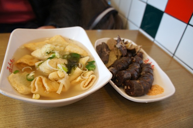 อันนี้เป็นซุปใสลูกชิ้นปลา (Eomukguk: 어묵국) กับถุงทองที่มีไส้เป็นเส้น chapchae และข้างๆเป็นไส้กรอกเลือดกับเส้น และเครื่องในต้ม