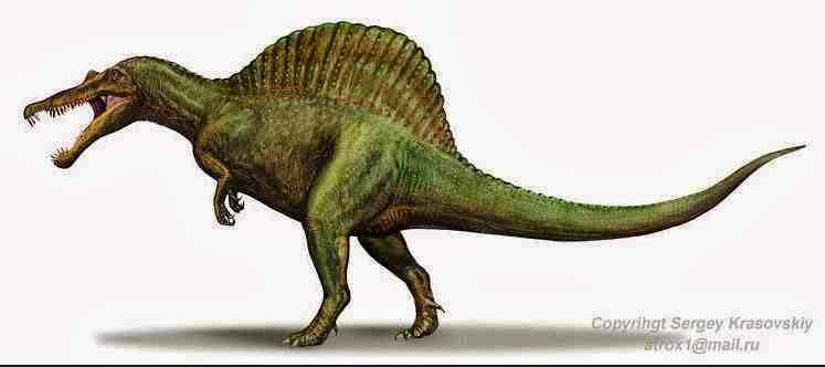 ห่างไกลออกไปทางทิศเหนือ บริเวณที่ลำธารสายหนึ่งไหลลงมาบรรจบกับทะเลสาบแห่งนี้ สไปโนซอรัสสามตัว กำลังยืนสงบนิ่งอยู่ริมลำธารด้วยความอดทนในการล่าเหยื่อ เฉกเช่นเดียวกันกับเจ้าจระเข้ดึกดำบรรพ์