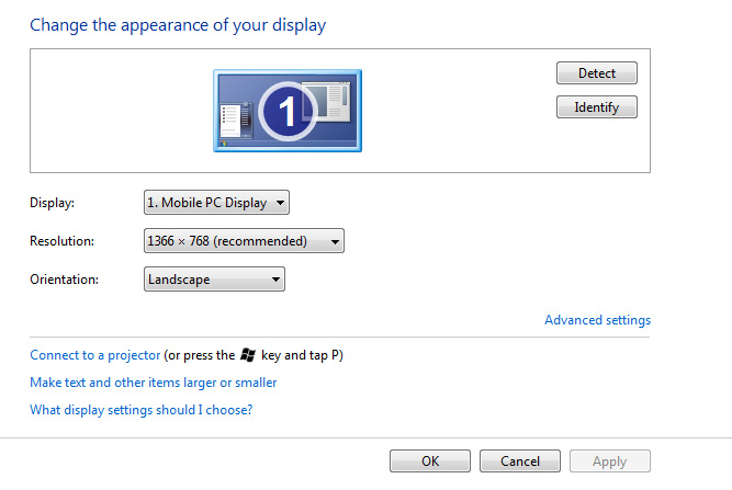 พยายามไปตั้งค่าที่ personalize ก็จะมีเพียงหน้าจอเดียว เมื่อ click เลือกที่ detect ก็จะมีเพียงเลข 1 ขึ้นมา ตามรูปค่ะ