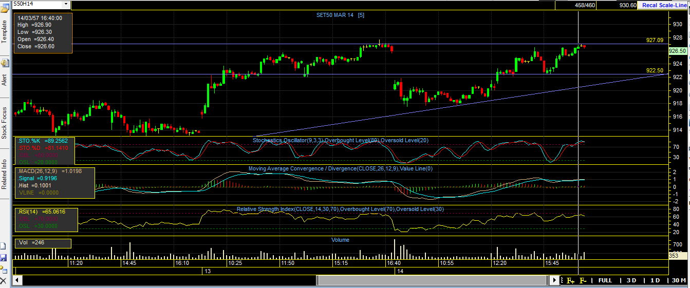 ดูเเล้วมี 2 กรณี เเผนเเรก ยึดเเนวเส้น Up Trend เป็นหลัก เเล้วรอดูตลาดว่าจะเปิดมาในรูปแบบไหน โดยถ้าเปิดมาปกติในกรอบที่ตีไว้ 922 - 927 ผมจะหาจังหวะเปิด Long โดยดู STO ประกอบว่าลงมาต่ำหรือยังค่อยเปิดหากว่าเปิดเเล้วหลุดเส้น Up Trend ผมให้