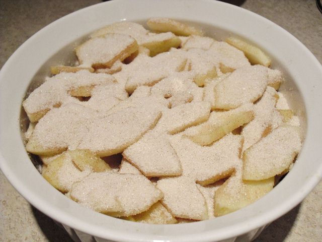 สไลด์แอปเปิ้ล ผสมน้ำตาลทราย, แป้ง และ cinnamon โรยบนแอปเปิ้ล