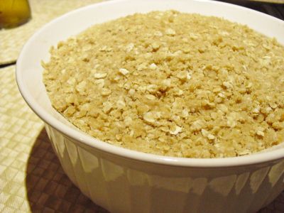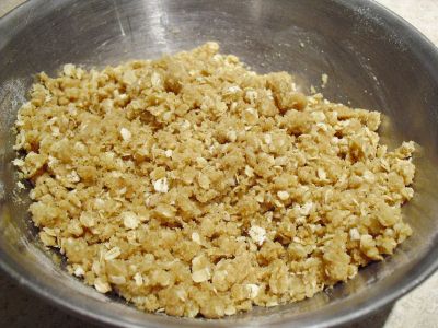 ผสมข้าวโอ๊ต, แป้ง, น้ำตาลทรายแดง, ผงฟู, baking soda และ เนยละลาย โรยให้ทั่วแอปเปิ้ลที่เตรียมไว้