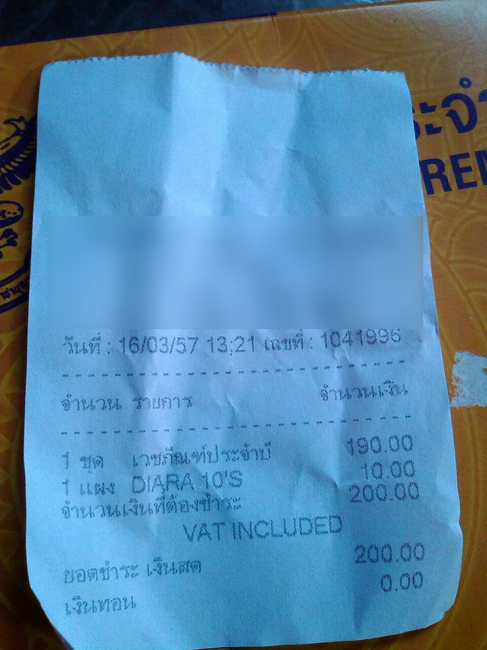 เมื่อวาน จขกท. และน้องสาวได้ไปซื้อยาที่มีสาขาในห้างหลายๆแห่ง อักษรย่อ ซด. น้องสาวได้ขอซื้อยาสามัญประจำบ้าน จำนวน 1 ชุด ราคาที่ติดไว้บนกล่อง คือ 175 บาทครับ ... พอนำไปคิดเงินพนักงานของทางร้านได้ทำการลอกสติ๊กเกอร์ราคา บนกล่อง ออกแล้วคิดเงินราคา 190 ตามในใบเสร็จ แต่พนักงาน ลืมลอกสติ๊กเกอร์ตรงข้างกล่องออกที่ติดราคา 175 บาทไว้