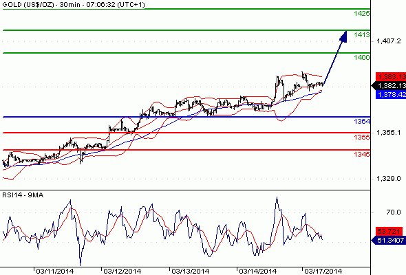 Our preference: Long positions above 1364 with targets @ 1400 & 1413 in extension.