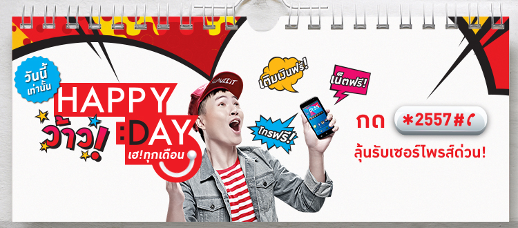 สำหรับผู้ใช้งาน Happy อย่าลืมรีบกดรับสิทธิ์กับ "แฮปปี้เดย์ เฮทุกเดือน!" ซึ่งวันนี้ (18 มีนาคม 2557) วันเดียวเท่านั้นครับ โดยกด *2557# แล้วกดโทรออก แล้วลุ้นรับ ค่าโทรฟรี เน็ตฟรี หรือ เติมเงินฟรี