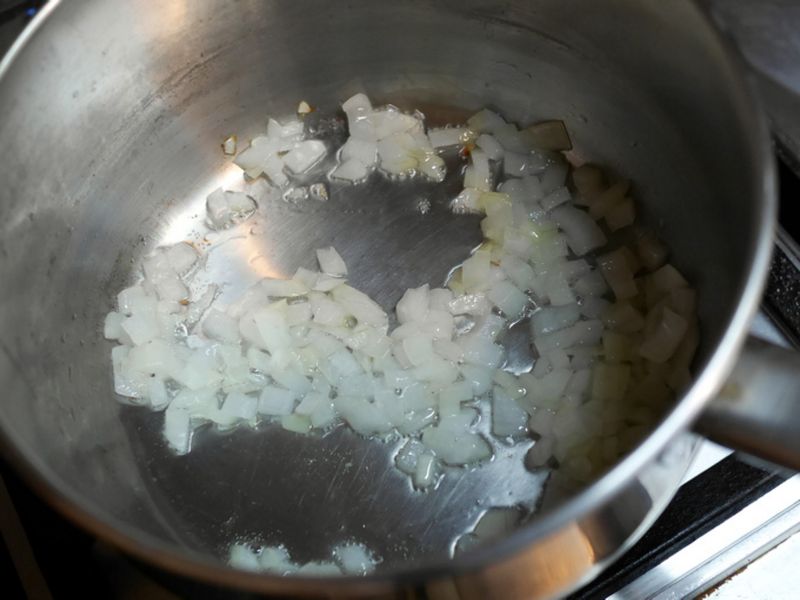 เอาหอมใหญ่ซอยละเอียด ไปผัดกับเนย ไฟอ่อนประมาณ 5 นาที