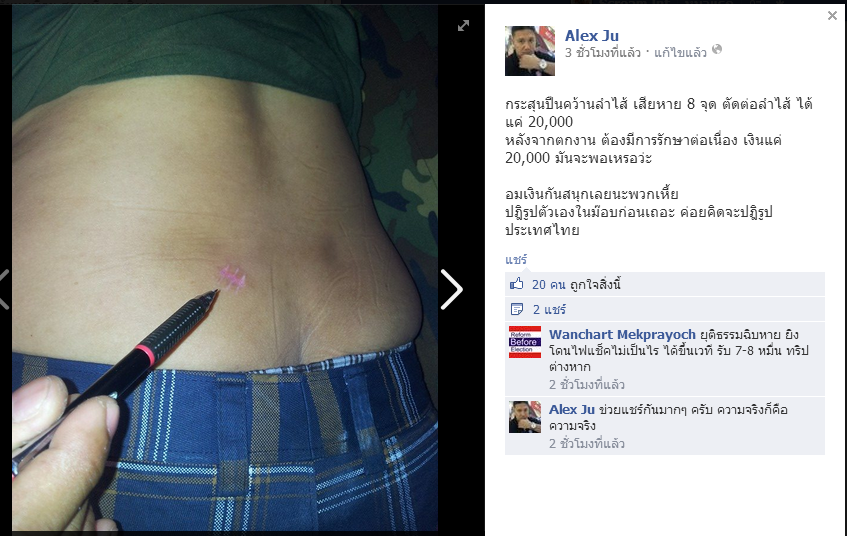 ผู้ใช้ไอดี Alex Ju ซึ่งเป็นการ์ด กปปส. ได้เขียนข้อความบนเฟสบุ้คแฉความเน่าเฟะ ของแกนนำม็อบ กปปส. หากินกับเงินบริจาคกันสนุกสนานเป็นล้านๆ หวังเป็นรัฐบาลแทนยิ่งลักษณ์ ไม่ได้มีอุดมการณ์อะไร ขนาดการ์ดโดนยิงไส้ทะลุ โยนเงินให้รักษาตัวแค่ 20000 บาท พอเอาบิลไปเบิกค่าล้างแผลเพิ่มเติม โดนตะคอกใส่ “อยากได้เงินเหรอ เงินเยียวยาไม่มีหรอก ถ้าอยากได้ต้องตายก่อนถึงจะได้ 1 ล้าน”
