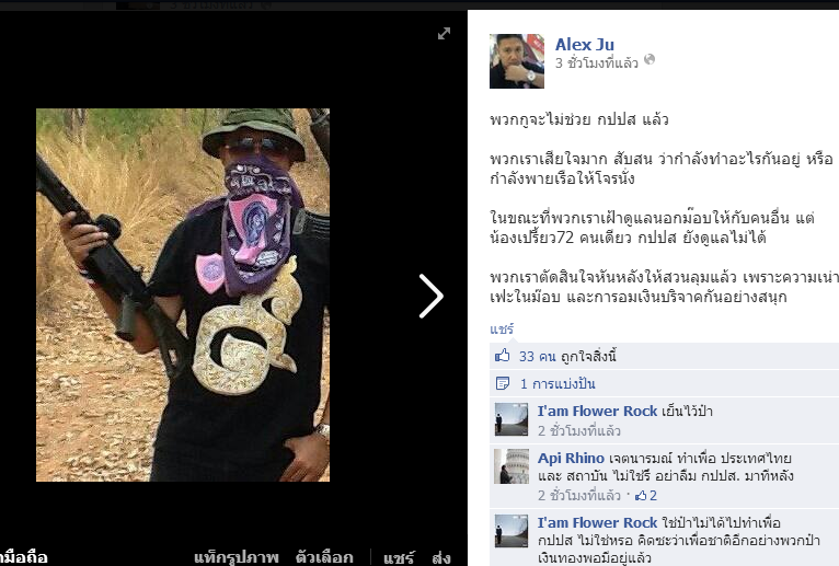 “พวกกูจะไม่ช่วย กปปส แล้ว พวกเราเสียใจมาก สับสน ว่ากำลังทำอะไรกันอยู่ หรือ กำลังพายเรือให้โจรนั่ง ในขณะที่พวกเราเฝ้าดูแลนอกม๊อบให้กับคนอื่น แต่น้องเปรี้ยว72 คนเดียว กปปส ยังดูแลไม่ได้ พวกเราตัดสินใจหันหลังให้สวนลุมแล้ว เพราะความเน่าเฟะในม๊อบ และการอมเงินบริจาคกันอย่างสนุก”