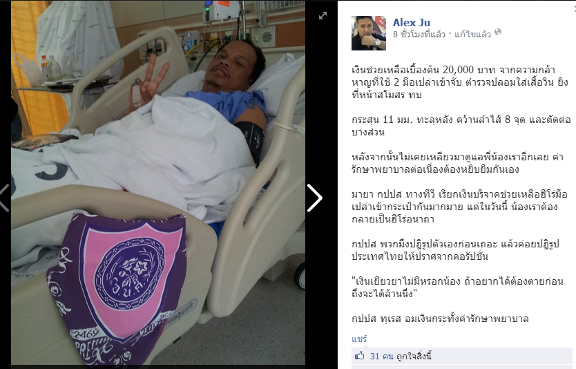 คนเขาบริจาคช่วย ฮีโร่มือเปล่า ที่กล้าสู้ปืน หน้าสโมสร ทบ กันมากมาย มาวันนี้ ต้องให้น้องกูกลายเป็นฮีโร่อนาถา หยิบยืมเงินรักษาพยาบาลกันเอง”