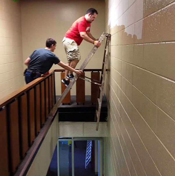 คือจากรูปที่เห็นนี้ ผมสงสัยน่ะครับว่า วางบันไดเอียงพิงกำแพงแบบนี้ มันจะไม่หล่นเหรอครับ แล้วสมมุติเกิดมันหล่น คนด้านหลังสุดที่จับอยู่ จะช่วยอะไรได้อ่ะ ผมสงสัยความคิดคนที่ปีนบันไดนี้ไปทาสีมากๆเลย