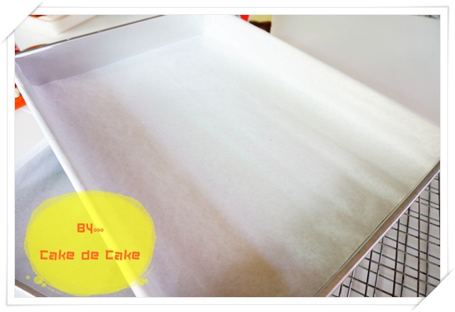 1. เตรียมถาดอบขนาด 9*13 นิ้ว ปูด้วยกระดาษไข เพื่อป้องกันกระดาษไขเลื่อนให้ติดสก๊อตเทปตรงปลายกระดาษไขกับถาดอบ