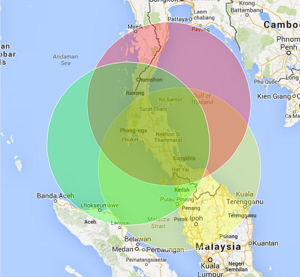 นี่คือภาพรวมรัศมีการตรวจการณ์/ตรวจจับของระบบเรดาร์ของไทยทั้ง 3 สถานีในภาคใต้