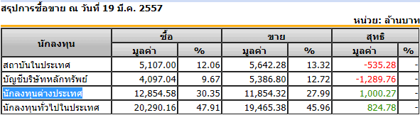 Sinthorn Summary 19/3/2557 : ต่างชาติซื้อสุทธิ 1,000.27 ลบ.