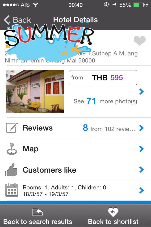 ล่าสุด ไปเชียงใหม่ เปิดหาข้อมูลห้องพัก ก็ดูข้อมูลผ่านเวปนี้ (ก็เวลาเสิร์ชหาห้องพัก เวปนี้ขึ้นมาแนะนำเป็นเวปแรก) ซึ่งก็จะโชว์ราคาห้องแต่ละที่พร้อมทั้งราคาที่ลดให้ ซึ่งเราก็คิดว่าจะดูแค่ข้อมูลห้องพักเท่านั้น แล้วค่อยโทรไปจองกับโรงแรมเอง ไม่คิดจะจองผ่านเวปละ ในเวปบอกราคาเราแบบในภาพนี้นะคะ