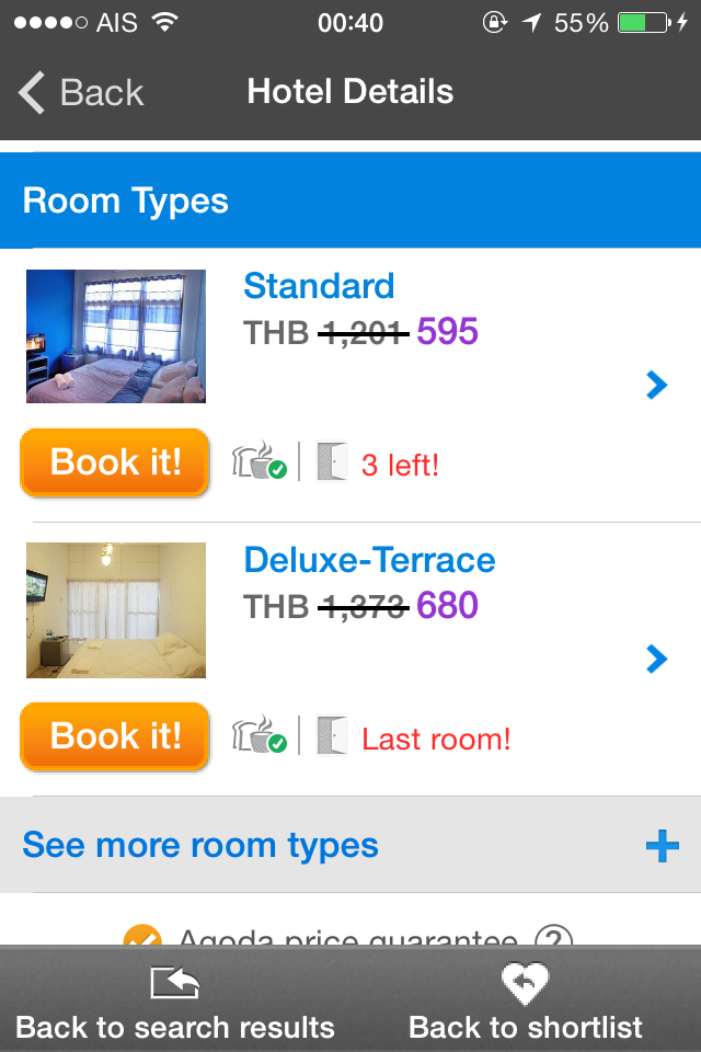 จึงใช้บริการครั้งที่ 2 คราวนี้จองเพราะไปทำงานต่างจังหวัด จัดแจงจองให้ตัวเองและคนอื่นในที่ทำงานด้วย ในเวปบอกราคาเต็มและราคาลดถ้าจองผ่านเวป เราก็โอเค ได้ห้องราคาถูกกว่าจองกับทางโรงแรมเอง จนกระทั่งไปเช็คอิน ถึงได้รู้ว่าราคาห้องพักจริงๆแล้วก็คือราคาที่ทางเวปบอกว่าลดนั่นแหละ
