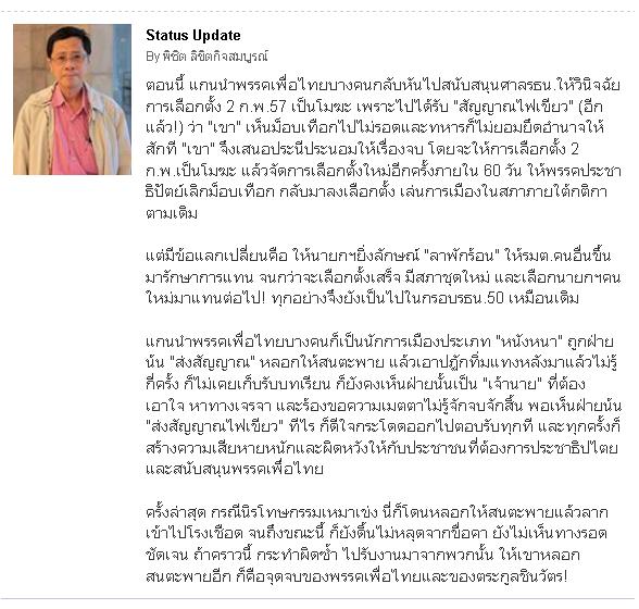 ผมเชื่อว่า ถึงยังไงก็ไม่มีเลือกตั้ง การเดินเกมส์เลือกตั้งจะแพ้ในที่สุด คงอยู่ได้อีกไม่กี่วันนับถอยหลังได้ พวกเผด็จการเขา