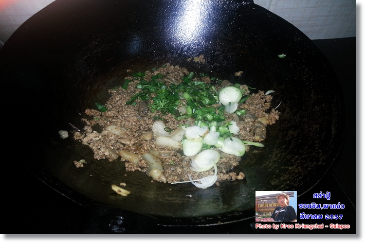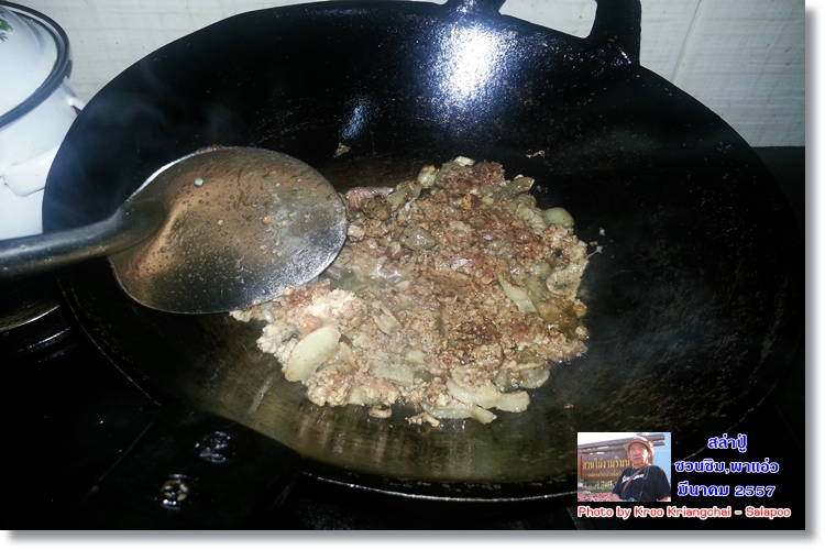 เอาหมูสับ เครื่องในซอย พริกลาบ น้ำซุปนิดหน่อย คลุกผสมกัน ตั้งกระทะเติมน้ำมันนิดหนึ่ง