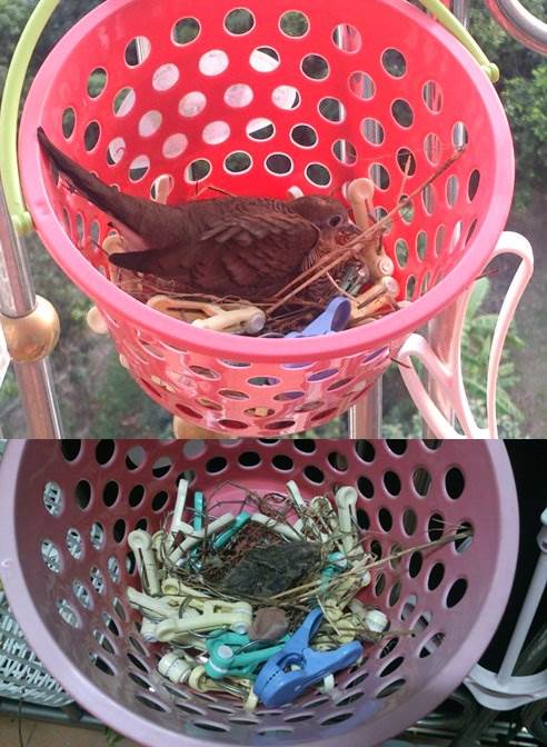 คือบ้านเราจะมีคานหน้าบ้านตรงกลางเป็นเหล็ก มีนกเขาใหญ่คู่ตัวผู้ตัวเมียมาทำรัง มันคีบหญ้าแห้งมาหล้นตลอด พยายามสุดๆคีบเป็นเดือนเพื่อทำรัง พ่อเราก็สงสัยหญ้าตกลงตลอด จนในที่สุดนเอนก็สร้างรังเสร็จ น้อนฉลาดม