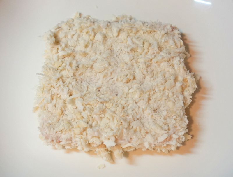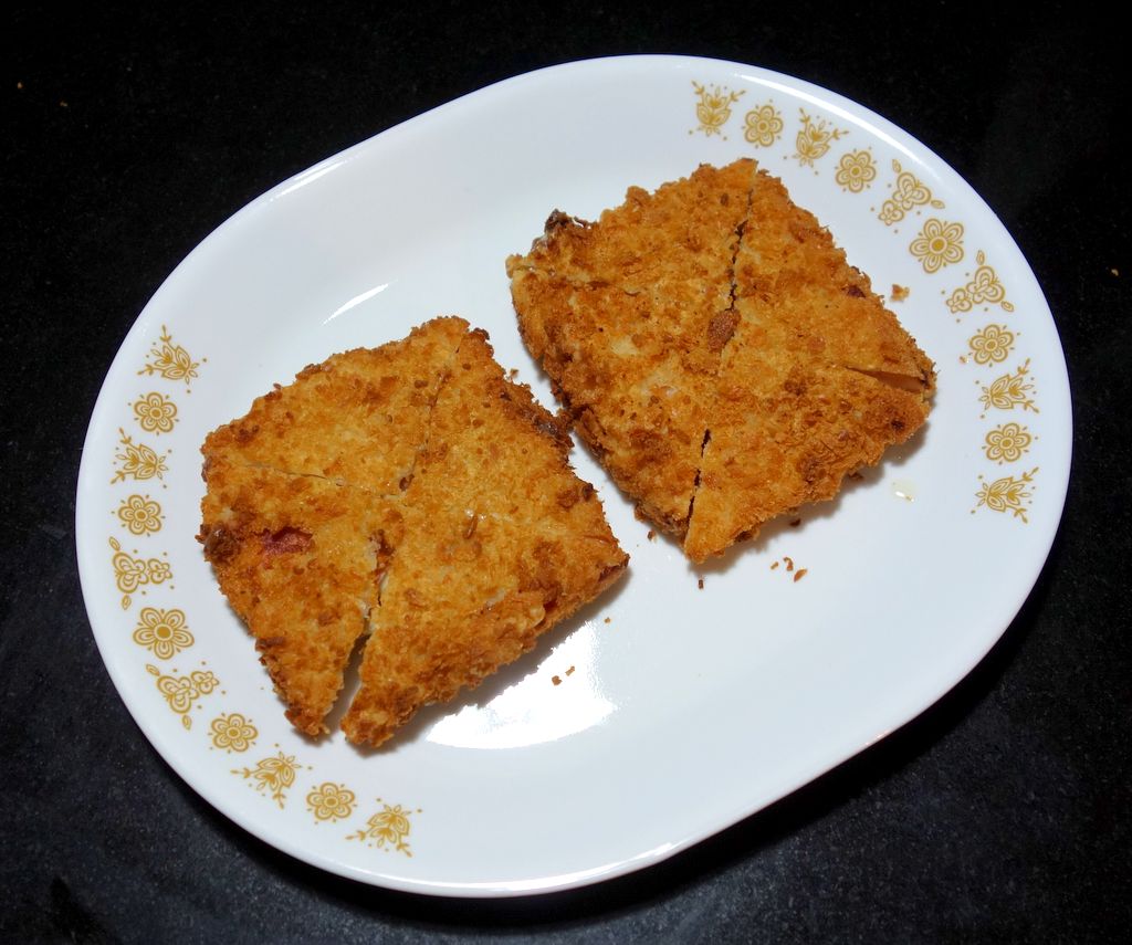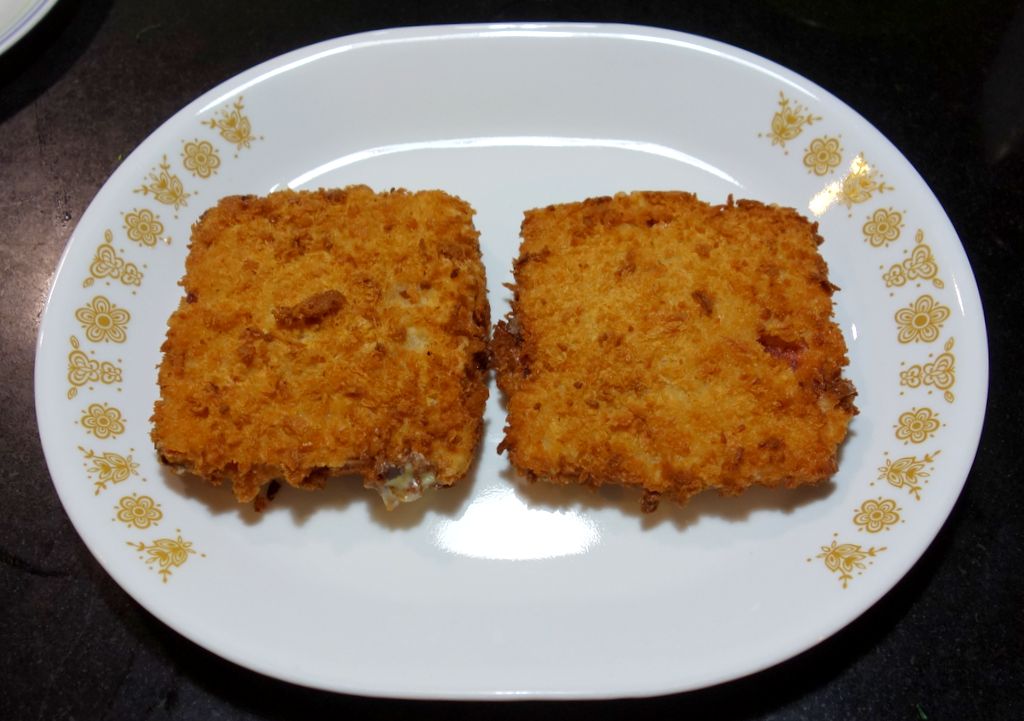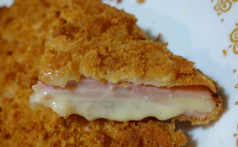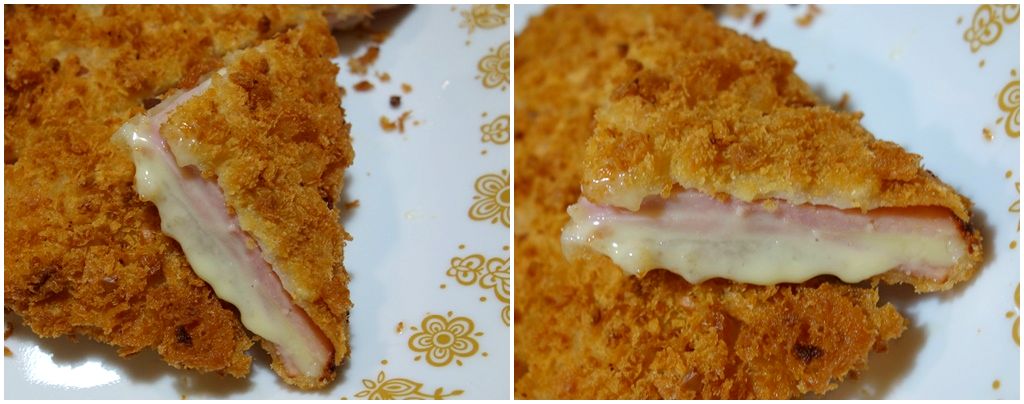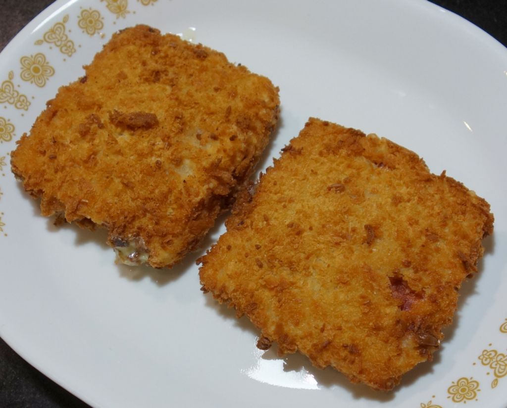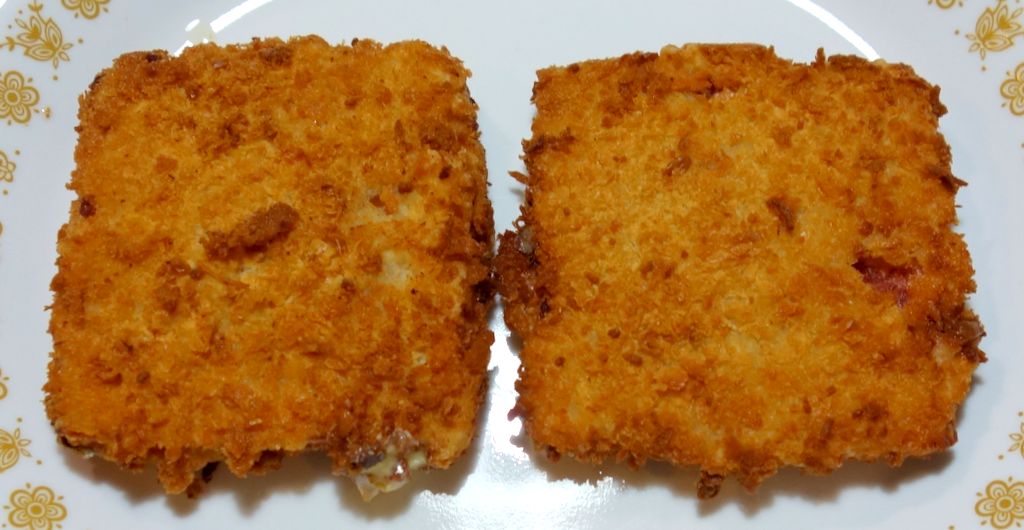 คุ้กแฮมแผ่นสี่เหลี่ยม 2 แผ่น สอดไส้ด้วยชีสแผ่น นำไปชุบเกล็ดขนมปังทอด