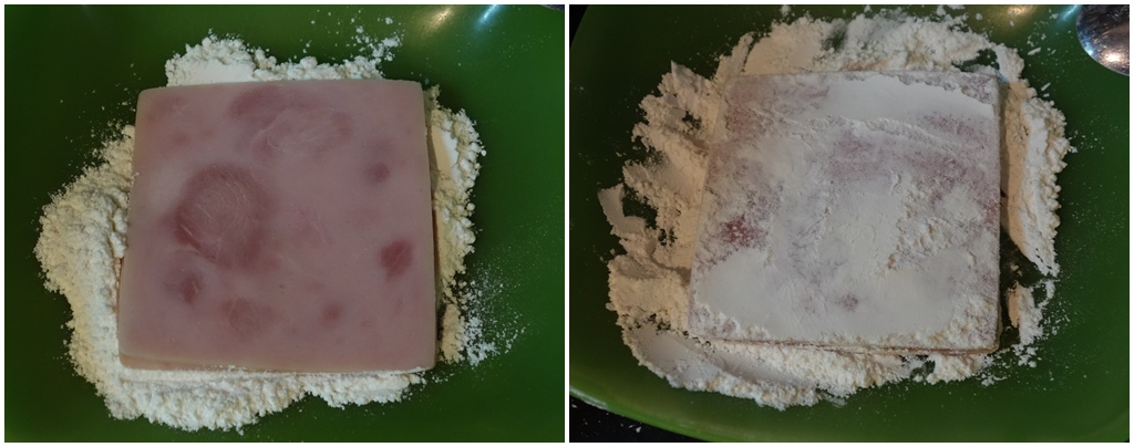 นำแฮมไส้ชีส ไปคลุกแป้งสาลีก่อน เพื่อที่ว่าตอนไปชุบแป้งผสม แป้งจะได้ติดกับเนื้อแฮม