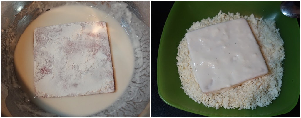 คลุกแป้งผสมน้ำ แล้วนำไปคลุกเกล็ดขนมปัง