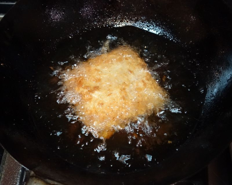 นำไปทอดในน้ำมันท่วม อุณหภูมิน้ำมัน 180 C ตรวจความร้อนโดยใช้ตะเกียบแห้งจิ้มไปในน้ำมัน ถ้ามีฟองอากาศออกมาแปลว่าอุณหภูมิน้ำมันร้อน 180 C แล้ว ใส่แฮมคลุกเกล็ดขนมปังลงไปทอด