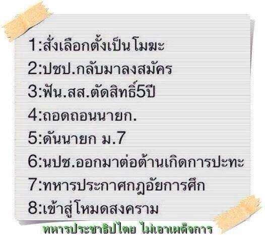 จากข่าว : http://www.manager.co.th/Politics/ViewNews.aspx?NewsID=9570000008543 จับประเด็น ธงคือ เลื่อนเลือกตั้ง หรือ เลือกตั้งโมฆะ หรือ ปฏิวัติ ยึดอำนาจ ก่อนเลือกตั้ง!!! บทสรุปจากข่าว คือ ถ้ามติ ศาล