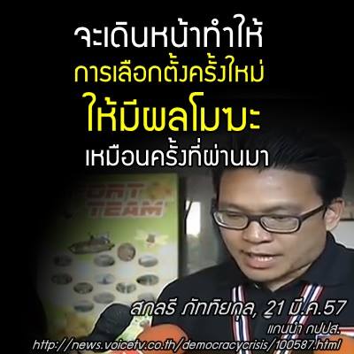 แกนนำกปปส. ยืนยันทำให้การเลือกตั้งครั้งใหม่เป็นโมฆะเหมือน 2 ก.พ.หลังศาลรัฐธรรมนูญมีคำวินิจฉัยออกมาแล้วว่าการเลือกตั้งวันที่ 2 ก.พ.57 ขัดรัฐธรรมนูญ