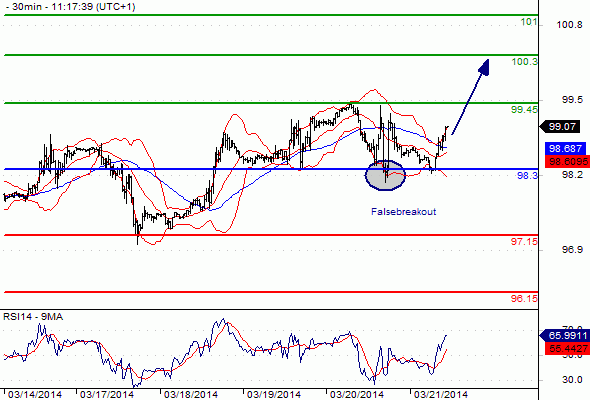 Most Likely Scenario: Long positions above 98.3 with targets @ 99.45 & 100.3 in extension.