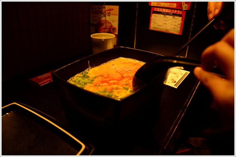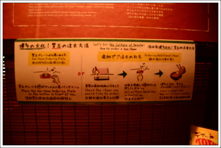 นั่งปุ๊บจะมีกระดาษอยู่ข้างหน้าเราคล้ายๆ แบบสอบถามค่ะ (ลืมบอกไปว่าใบนี้ภาษาอังกฤษจะอยู่กับตู้กดข้างหน้า อย่าลืมหยิบติดมือเข้ามานะคะ) แต่จะเป็นสอบถามความนุ่มของเส้น ความข้นของซุบ ใส่โรยหน้า อะไรประมาณนี้ค่ะ กรอกเสร็จวางพร้อมตั๋วที่กดมา กดกริ่งจะมีมือลึกลับมาคว้าไปค่ะ