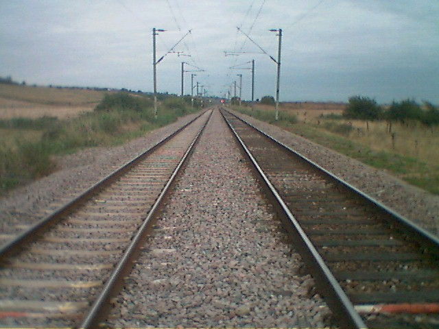 ส่วน "รถไฟทางเดี่ยว" จะเป็นแบบนี้ครับ ( มีรางยาวแค่แถวเดียว ปัญหาคือเมื่อมีรถไฟอีกขบวนสวนมา ต้องมีชบวนใดขบวนหนึ่งเสียเวลามากๆ ในการจอดรอให้อีกขบวนไปก่อน )
