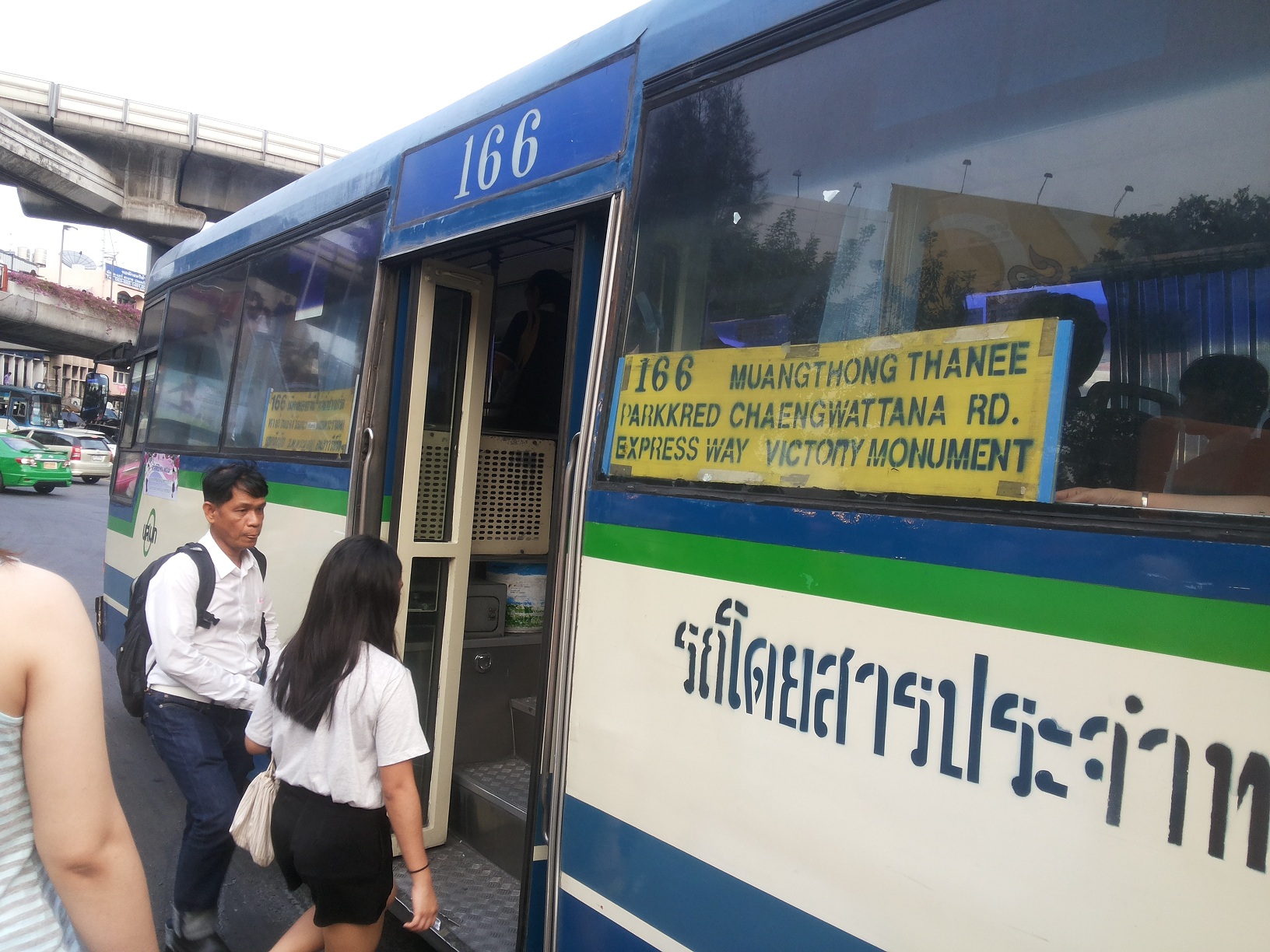 ส่วนข้อเสียคือ ถ้าไม่ได้นั่งเนี่ยจะเมื่อยครับ 55 และรถมันจะขับวนไปปากเกร็ดก่อน ทำให้เวลาในการเดินทางเพิ่มไปเป็นประมาณ 1 ชม หรือมากกว่า ถ้าใครรีบจริงเนี่ย แนะนำว่าให้นั่งรถตู้ดีกว่าครับ แต่ถ้าเวลาเหลือ แนะนำ รถเมล์ครับ นั่งสบายไม่อึดอัด อ้อสำหรับรถเมล์มีสิ่งหนึ่งต้องระวังครับคือ รถสาย 166 มันจะมี 2 แบบ คือ ไปแค่ปากเกร็ด กับเข้าเมืองทองด้วย วิธีดูคือดูป้ายด้านหน้า และด้านข้างครับ ถ้าเป็นสีเหลือง จะเข้าเมืองทองด้วย (ตามรูปเลยครับ) แต่ถ้าเป็นสีแดง จะไปแค่ปากเกร็ด ถ้าเอาให้ชัวร์จริงๆก็ถามพี่กระเป๋ารถเมล์ก่อนขึ้นครับ (กระเป๋ารถเมล์สายนี้ค่อนข้างมารยาทดีครับ ผมนั่งบ่อย ^^)