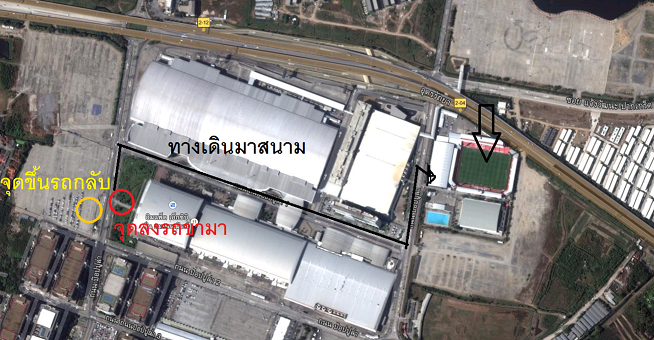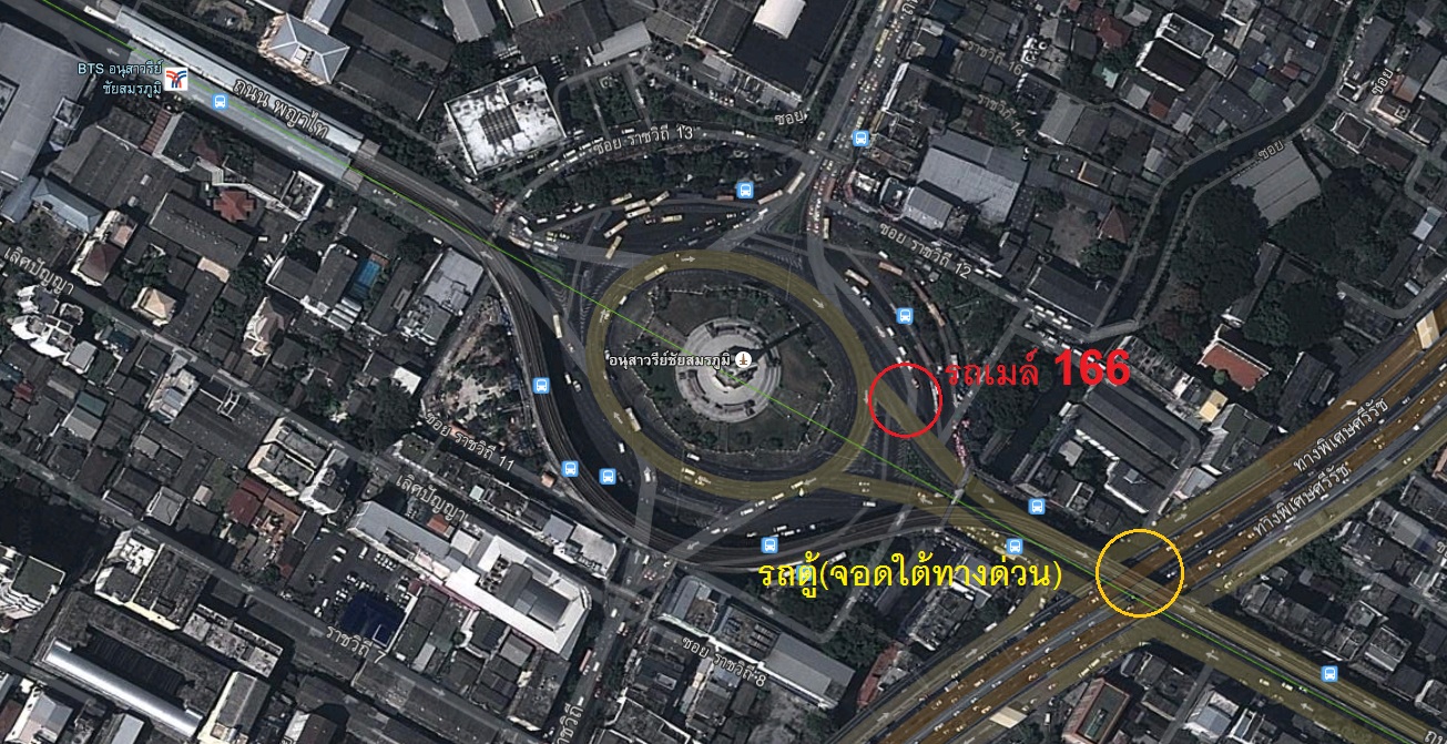 โดยผมจะเริ่งตั้งแต่การเดินทางเลยแล้วกันครับ โดยจะตั้งต้นกันที่อนุสาวรีย์ชัย จุดที่คิวรถตู้ชุมที่สุดในประเทศไทยครับ โดยการเดินทางไปสนามเมืองทองแบบไม่ต้องขับรถไปเองนั้นมีสองวิธีคือ นั่งรถเมล์สาย 166 หรือ นั่งรถตู้ไปครับ โดยตำแหน่งของทั้งสองวิธีก็ตามรูปนี้เลยครับ