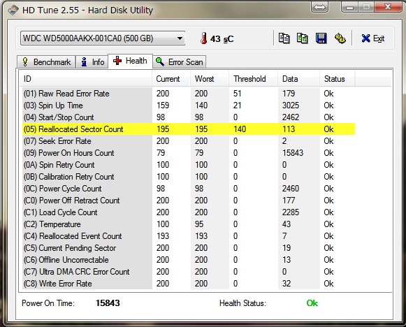- เมื่อสองวันก่อน อยู่ดี ๆ คอมค้าง (บางทีค้าง 2-3 นาทีแล้วก็หายเอง) ถ้าปิดเปิดเครื่องใหม่จะบูทหน้า bios ไม่ค่อยติด ตอนแรกก็คิดว่าเป็นเพราะเครื่องร้อน จนช่างที่เขาดูเครื่องให้ใช้โปรแกรม HD Tune เช็คได้ผลแบบในรูปครับ