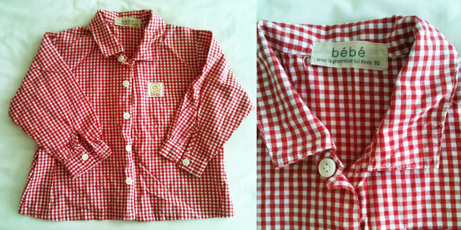 1. เสื้อเชิ๊ตแขนยาวสีแดง bebe size 90 ส่งต่อ 90 บาท
