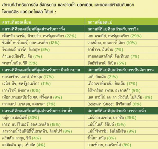 ระยะทาง 3,247 ไมล์ ของแหล่งน้ำสุดอันตราย แม่น้ำอะเมซอน ทวีปอเมริกาใต้ เป็นผู้นำในกลุ่มสถานที่ยอดแย่สำหรับการว่ายน้ำ โดยมีผู้โหวตให้เป็นจำนวนถึงหนึ่งในสี่จากผู้ร่วมโหวตทั้งหมด นอกจากนี้ สภาพอากาศที่รุนแรงของประเทศทิเบต ที่ความสูง 16,000 ฟุต เหนือระดับน้ำทะเล และกรุงเดลี หนึ่งในชุมทางที่พลุกพล่านมากที่สุดแห่งหนึ่งของโลก ทำให้ทั้งคู่ได้รับการโหวตให้เป็นสถานที่ยอดแย่สำหรับการวิ่งและปั่นจักรยาน