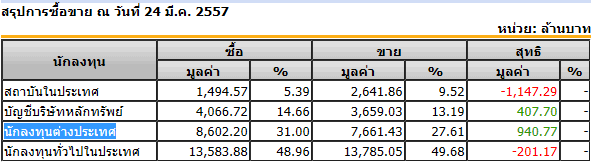 Sinthorn Summary 24/3/2557 : ต่างชาติซื้อสุทธิ 940.77 ลบ.