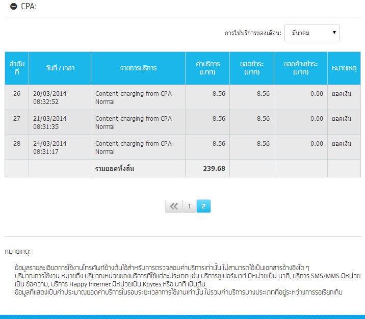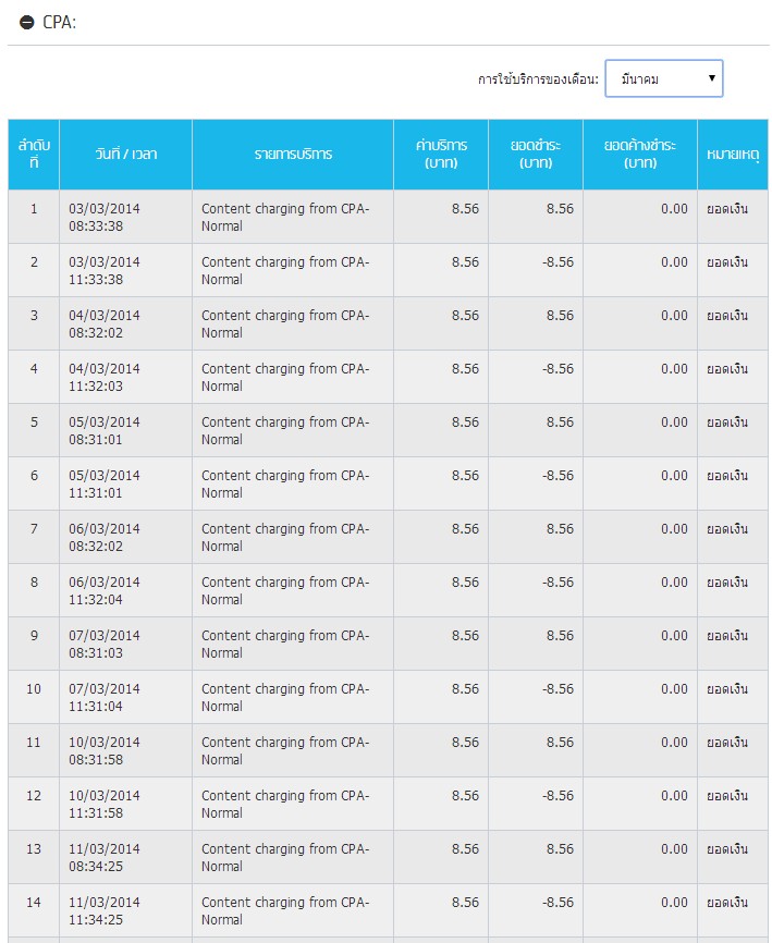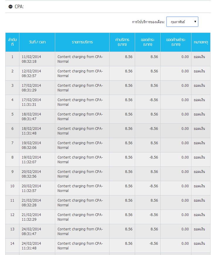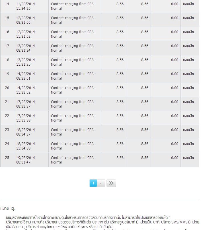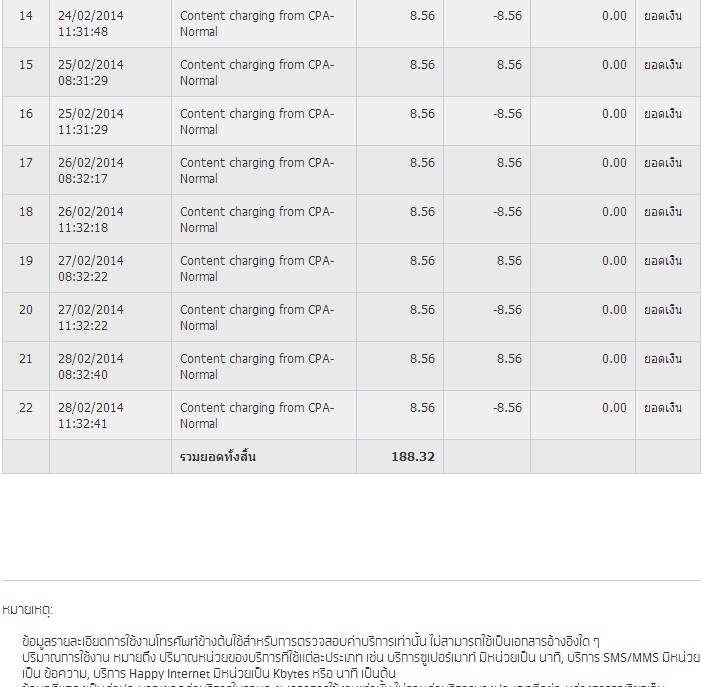 เรื่องมีอยู่ว่าผมโรมมิ่งมาอยู่ต่างงประเทศ (เผื่อใช้รับข้อความ OTP ธุรกรรมจาก อินเตอร์เนตเเบงค์กิ้ง) ประกฏว่าเงินในโทรศัพย์ที่ผมเติมไว้ค่อยๆให้ไปที่น้อยๆ ตอนแรกผมก็เข้าใจว่าคงมีคนmiss call(จากพวกขายของประกันอะไรต่างๆนาๆ) มามั้งเลยโดนตัดเงินผมก็เลยปิดเครื่องตลอดเวลาจะใช้ค่อยเปิดเครื่อง หลังๆมาอ่านว่าถ้าเราไม่รับหรือไม่ reject สายก็จะไม่โดนตัดเงิน ผมก็เลยลองเปิดเครื่องไว้บ้างซิ กะจะลองดูว่าเงินลดมั้ย หนึ่งเดือนผ่านประ ปรากฏว่าเงินหาย ประจวบเหมาะกับมีสาย miss call 3 สาย ผมก็เลยโทรไปถาม call center อ้างว่าไม่ได้โดนตัดเงินเพราะมีmiss call แต่โดนตัดเงินเพราะ ข้อความ MSS ภาพหน้าจอ(ผมใช้โนเกียแบบปุ่มกดจะมาโหลดทำไม) ตอนอยู่ไทยไม่มีพออยู่ ตปท มีได้งัยงง ไม่ได้สมัครด้วย เลยบอกให้ miss call ยกเลิก และผมขอเบอร์โทรติดต่อหน่วยงานMMS นี้ได้ เบอร์นี้มา021158814 โทรไปไม่มีคนรับ