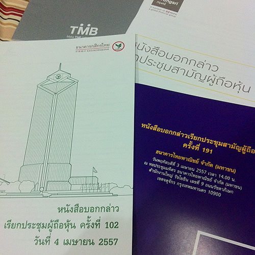 รับจดหมาย ... เอกสารการประชุมผู้ถือหุ้นต่างๆจะมีส่งให้เรามาทางจดหมาย ในช่องทางการลงทะเบียน จากศูนย์รับฝากหลักทรัพย์ ในจดหมายก็มักจะประกอบด้วยแบบลงทะเบียน (หรือแบบแสดงจำนวนหุ้น) ซึ่งเป็นเอกสารต้องใช้ในวันประชุมผู้ถือหุ้น รวมถึงเอกสารที่จะระบุถึงข้อมูลการประชุมผู้ถือหุ้น ในวาระต่างๆว่าจะมีการประชุมวาระอะไรบ้าง นอกจากนี้อาจมีหนังสือรายงานประจำปีแบบรูปเล่ม หรืออาจจะเป็นในรูปแบบ CD-Rom ก็ได้