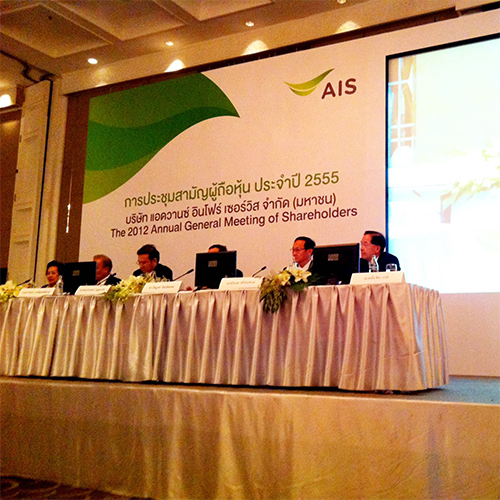 ภาพการประชุมผู้ถือหุ้น AIS บริษัทโทรคมนาคมที่ใหญ่ที่สุดในประเทศไทย ในปี 2555 หวังว่าการประชุม AIS วันพุธนี้ (26 มี.ค.) คงไม่มีดราม่าการเมือง โดยเฉพาะในช่วงเวลาที่สถานการณ์กำลังอยู่ในจังหวะอันร้อนระอุ