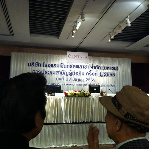 ภาพการประชุมผู้ถือหุ้น CENTEL ประจำปี 2555 บุคคลด้านหน้าสวมหมวกคือคุณวันชัย จิราธิวัฒน์ เป็นการประชุมครั้งสุดท้ายของคุณวันชัย ก่อนจะเสียชีวิตลงในอีก 5 เดือนถัดมา ... ขอแสดงความเสียใจด้วยครับ และนั่นคือครั้งสุดท้ายที่ผมได้ทักทายพูดคุยกับคุณวันชัย