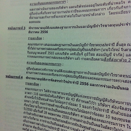 วาระการประชุมก็เป็นอีกสิ่งที่ควรอ่าน เพราะในแต่ละครั้งของการประชุม โดยทั่วไปการประชุมสามัญมักจะมีการประชุมเพื่อชี้แจงข้อมูลสรุปในรอบปีที่ผ่านมา รวมถึงการพิจารณาอนุมัติงบการเงิน , หรือแม้กระทั่งการพิจารณาจ่ายเงินปันผลด้วย ซึ่งแต่ละวาระก็ล้วนมีความสำคัญ ในแต่ละวาระเราสามารถสอบถามหรือต้องการการชี้แจงเพิ่มเติมจากผู้บริหารได้ด้วย บางวาระเช่นการจ่ายเงินปันผล เราอาจขอพูดเชิงเรียกร้องได้ด้วยว่าอยากให้บริษัทช่วยพิจารณาจ่ายเงินปันผลให้เยอะๆหน่อยในปีถัดไปก็ได้ ผมก็เคยเจออยู่บ่อยครั้งที่ผู้ถือหุ้นเรียกร้องให้บริษัทมีการจ่ายเงินปันผลให้สูงขึ้น คณะกรรมการมักจะเก็บข้อมูลไปพิจารณา ซึ่งอาจจะทำตามข้อเรียกร้องหรือไม่ทำก็ได้