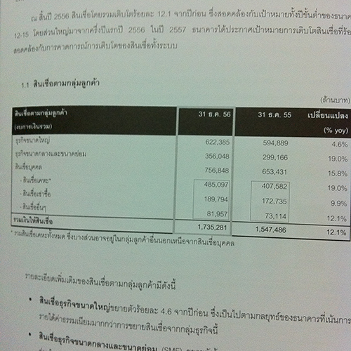 อย่างเช่นกลุ่มธนาคารอย่างในภาพด้านล่างมาจากรายละเอียดสรุปของธนาคารไทยพาณิชย์ เราเองอาจเริ่มมองภาพเศรษฐกิจไทยในภาพใหญ่ๆได้จากข้อมูลของบริษัทในกลุ่มอุตสาหกรรมการเงินด้วย เพราะถือว่าเป็นต้นน้ำของระบบวงจรธุรกิจ เช่นเมื่อดูข้อมูลเมือปี 55 กับปี 56 การเติบโตสินเชื่อธุรกิจขนาดใหญ่เป็นไปอย่างเบาบางมาก ซึ่งนั่นอาจเดาได้ว่าบริษัทใหญ่ๆเริ่มชะลอการลงทุนหรือไม่?